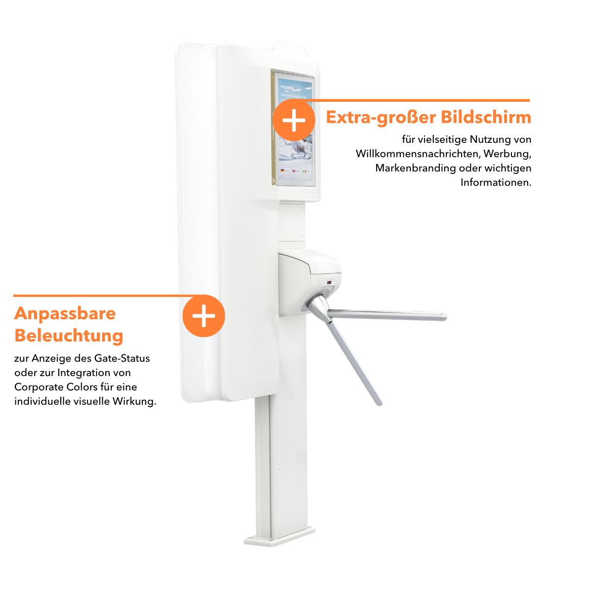 - Großes Display für Ticket- und Zutrittsinformationen, Werbevideos oder andere Textmitteilungen