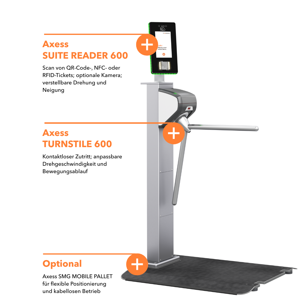 Wie alle Produkte von Axess verfügt auch dieses Gate über eine modulare Struktur, die eine außergewöhnliche Flexibilität in der Anwendung bietet. Es kann mit zusätzlichen Modulen wie Akkupack, WLAN, mobiler Palette, Drehkreuzen und vielen weiteren Komponenten ausgestattet werden. Dadurch lässt es sich optimal an die spezifischen Anforderungen verschiedener Veranstaltungsorte und Betriebsumgebungen anpassen.
