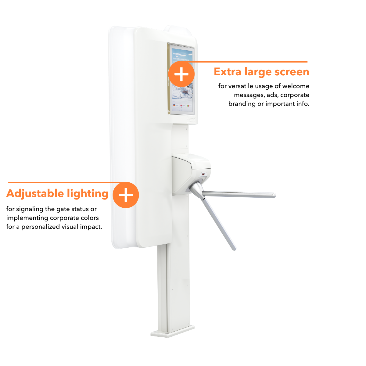 Its large display captures attention with promotional content, intuitive traffic-light signals guide guests effortlessly, and even faster ticket recognition ensures optimal access. Its modular design allows for customization to meet different needs and support various ticket reading methods, different barrier types (turnstile, flap and its accessible ADA versions), and different mounting types (e.g., floor-mounted, gantry-mounted, or mounted on an existing Axess pallet).