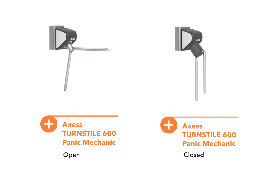 Axess TURNSTILE 600 Panic Mechanic: the arms drop automatically to clear the way if there is a power cut or an alarm.