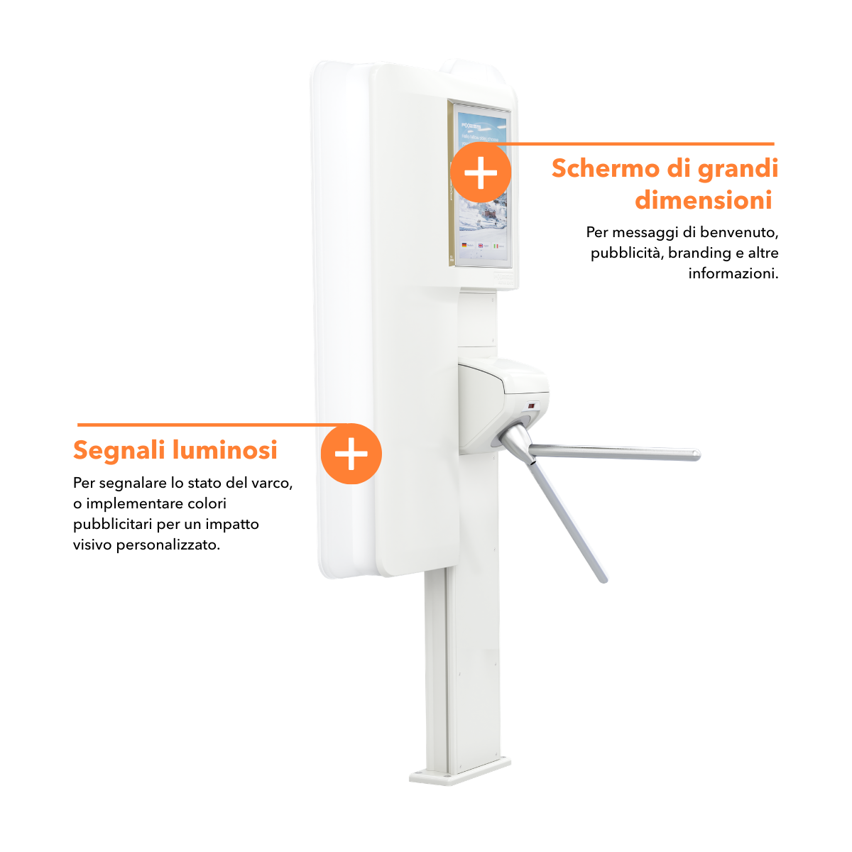 Il suo ampio display cattura l’attenzione con contenuti promozionali, i segnali intuitivi a semaforo guidano gli ospiti con facilità e il riconoscimento dei biglietti, ancora più rapido, garantisce un accesso ottimale. Il design modulare consente la personalizzazione per soddisfare diverse esigenze e supportare vari metodi di lettura dei ticket, diversi tipi di varchi (tornello, flap e le relative versioni accessibili ADA) e differenti modalità di installazione (ad esempio a pavimento, su struttura a portale o su pallet Axess esistente).